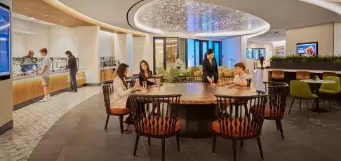 Our lounges are quiet, connected spaces to relax or work in, where you can refresh and refuel with a range of complimentary pre-flight bites and drinks
